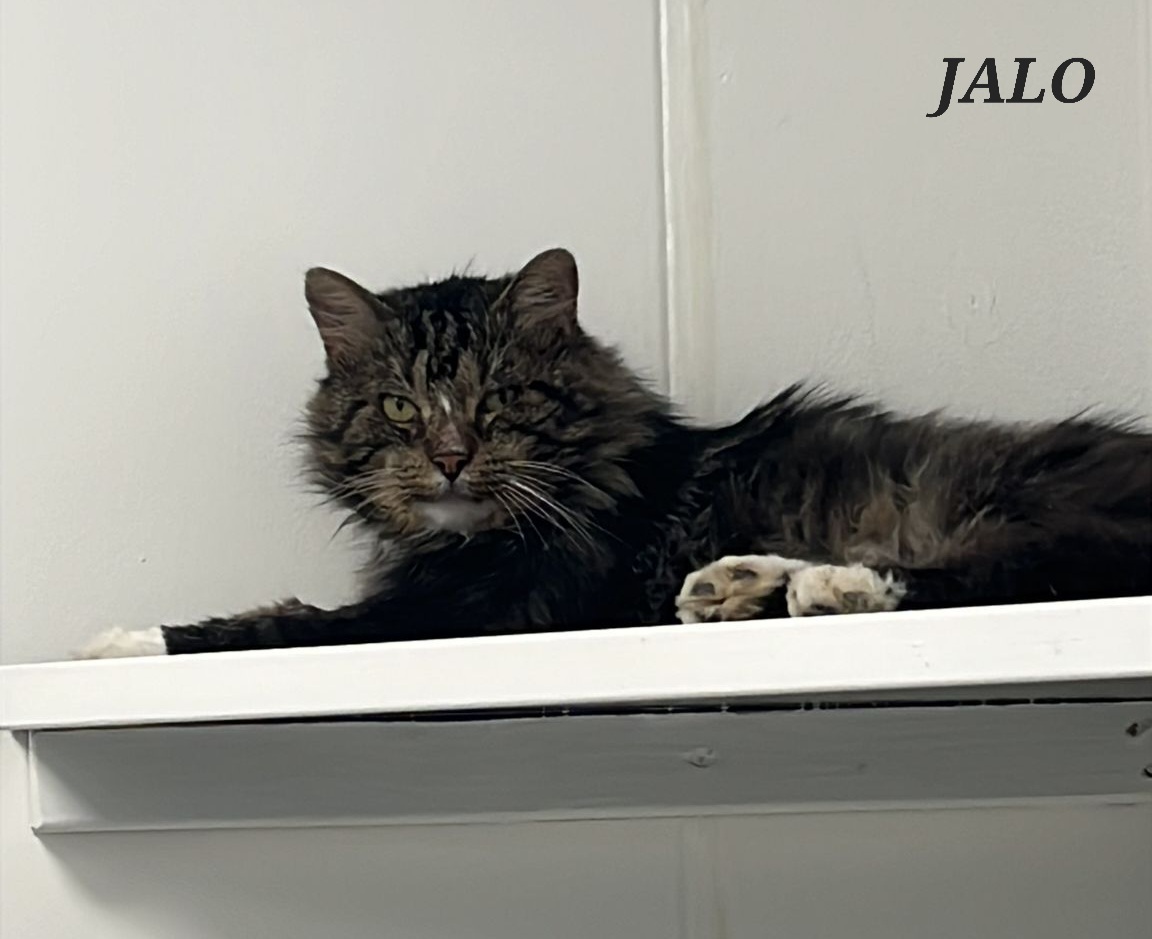 Jalo on vielä hieman arka löytökissa, joka on sijaiskodissa ollessaan kuitenkin jo hienosti reipastunut. Namien avulla Jalosta saa ystävän, toisinaan antaa jo hieman silittääkin. Leluilla leikkii lähinnä yksikseen, mutta joskus yllättää ja intoutuu sulkalelun kanssa leikitettäväksi. Mieluiten Jalo viettää aikaansa ihmisten touhuja ihmetellen, tai ikkunasta ulos katsellen.