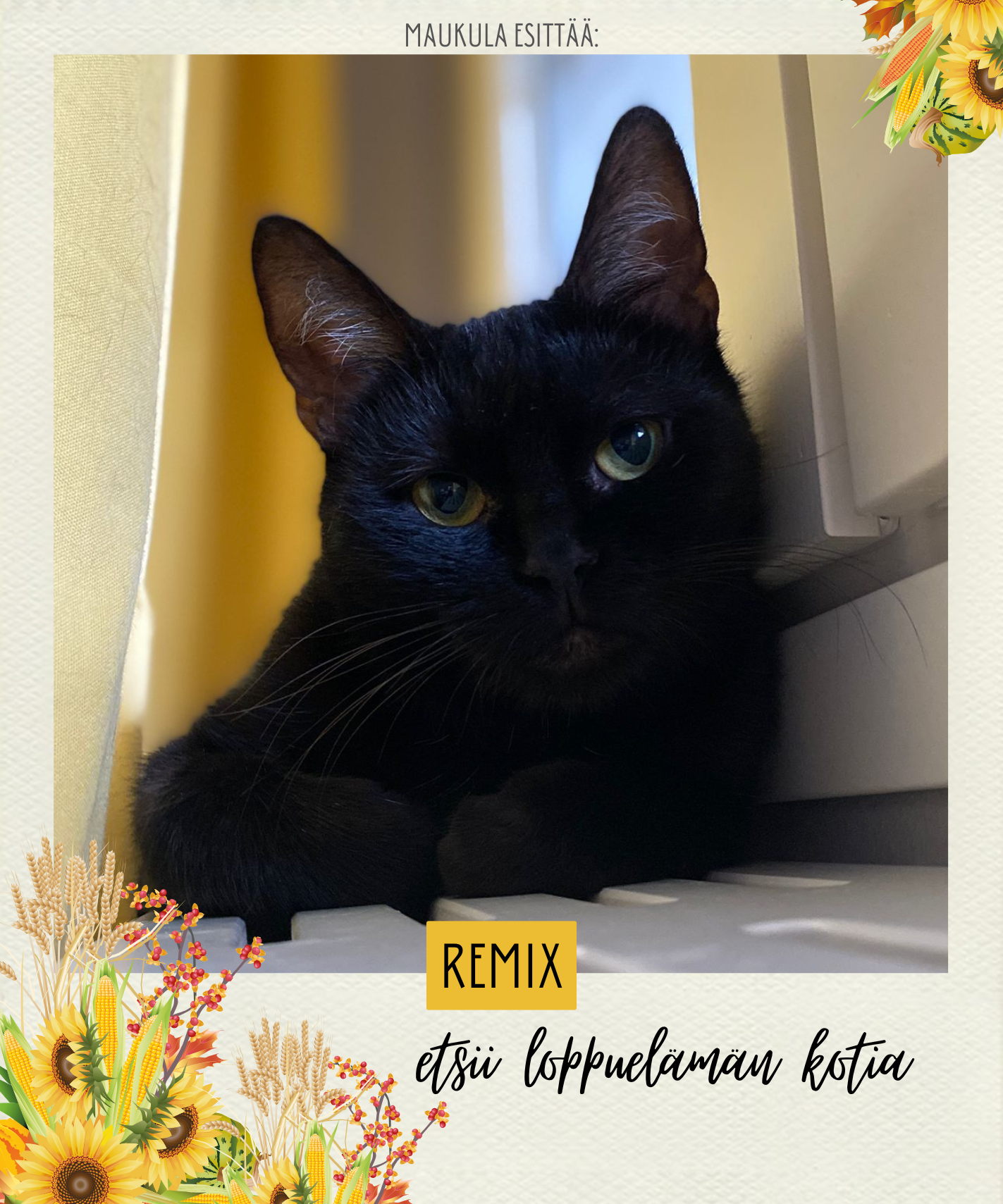 Olisiko sinulla tarjota Remixille rakastava koti? Laita meille sähköpostia osoitteeseen maukula@maukula.com ja kerro millaisen kodin voisit hänelle tarjota.
