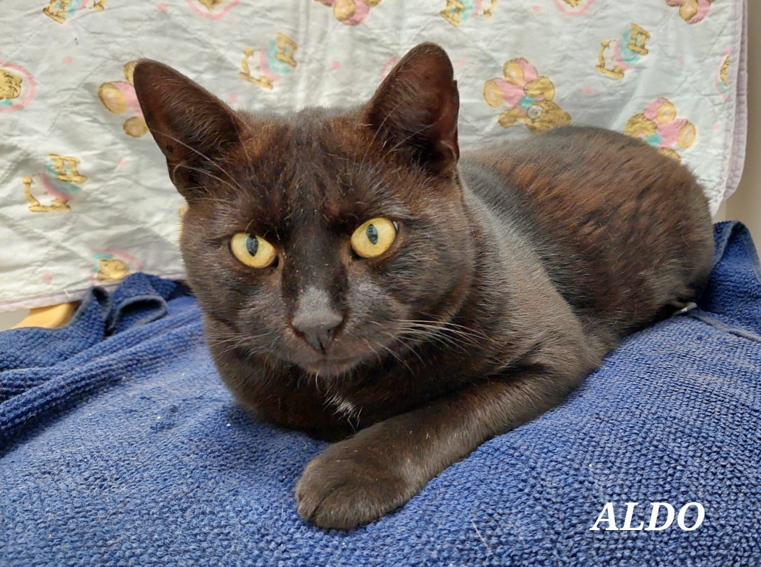 Reipas ja leikkisä Aldo asustelee yhdistyksen eläintalolla. Tuttujen ihmisten antaa jo hieman silittää, mutta mieluiten Aldo viettää päivänsä ystävänsä Spicyn kanssa riehuen, tai ihmisten touhuja tunnelista seuraillen. Aldo kokee myös tehtäväkseen huolehtia, ettei eläintalolla pääse tulemaan liiaksi ruokahävikkiä, kissakavereiden kupit hän avuliaana tyhjentää mielellään!