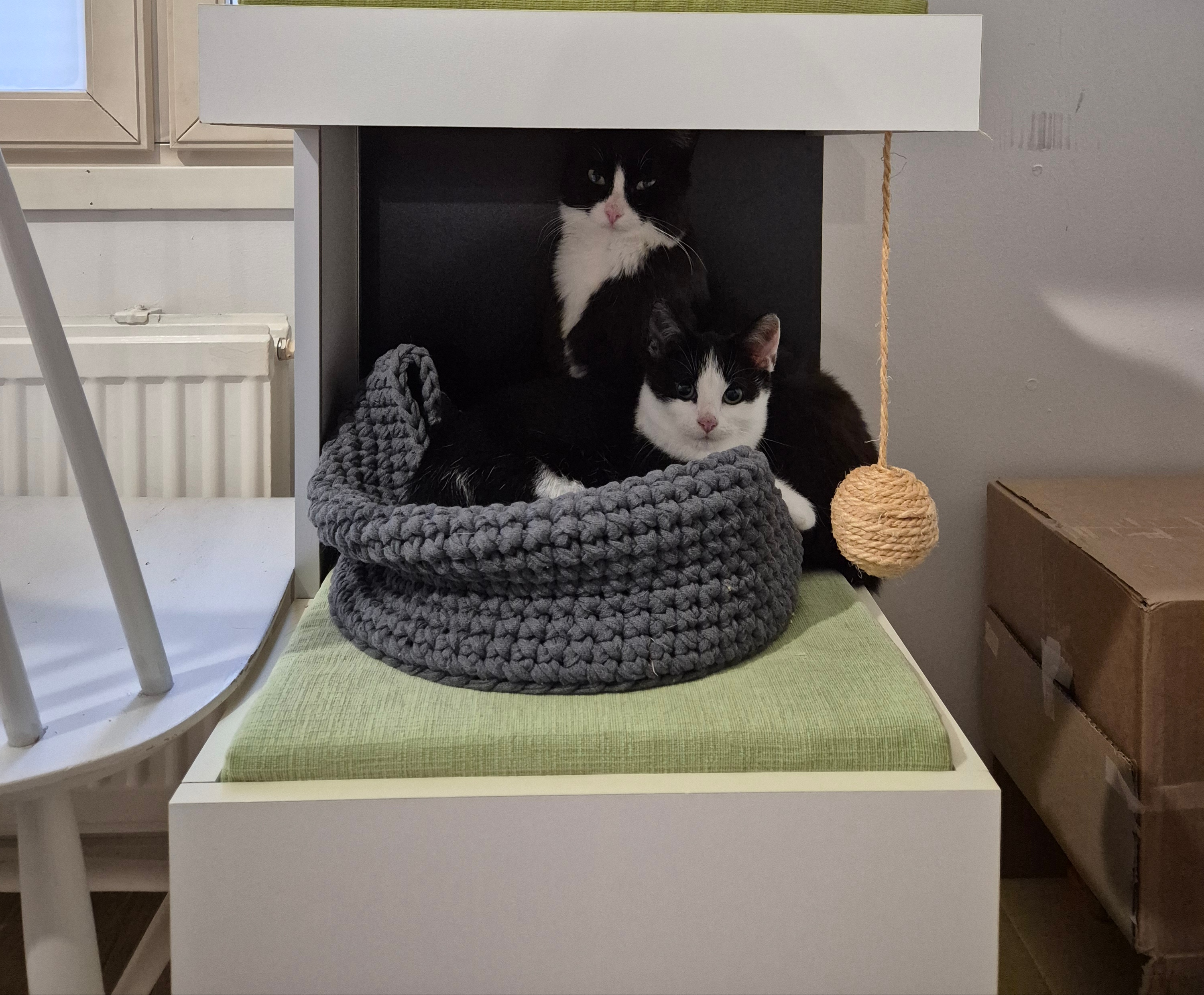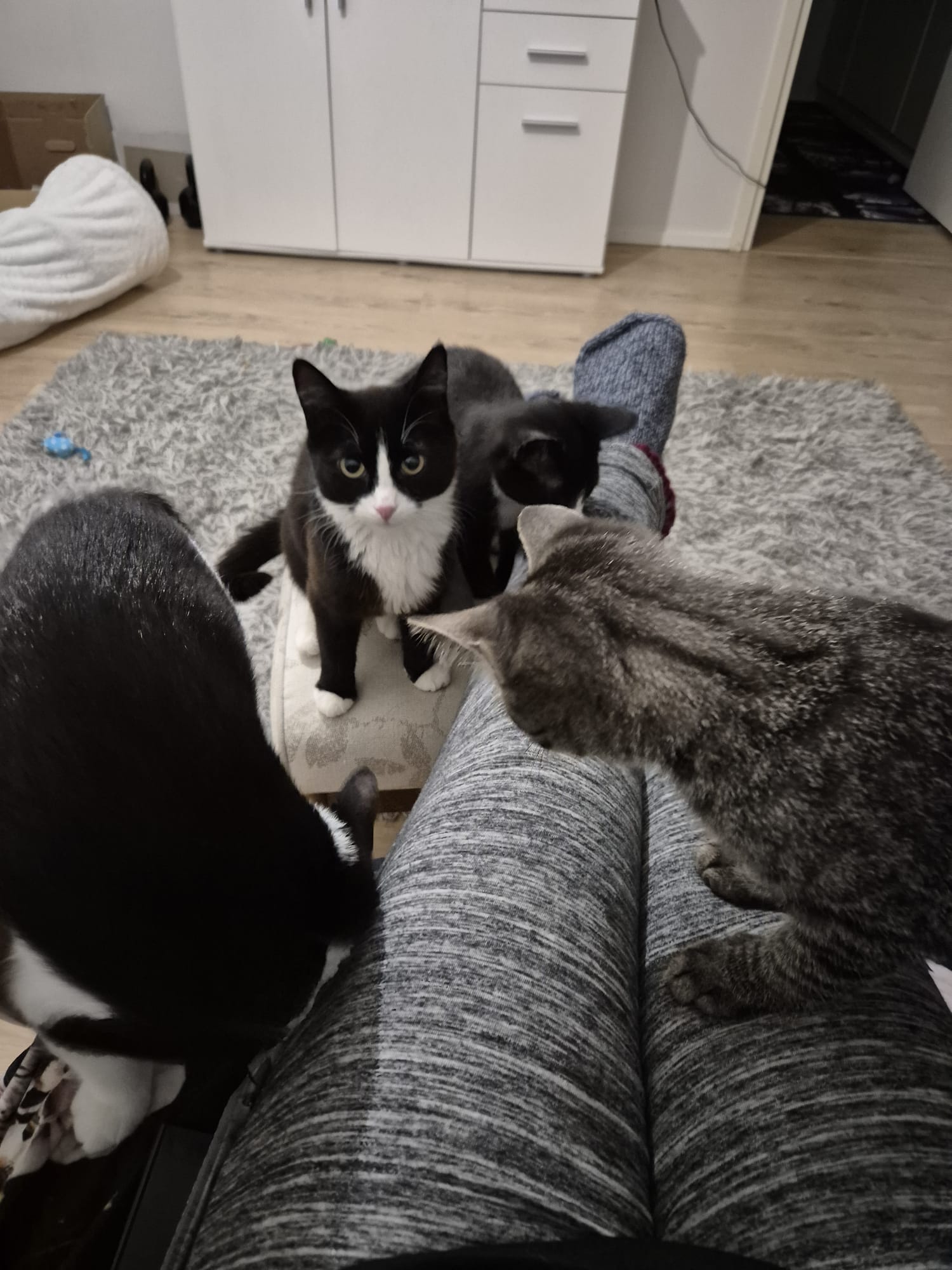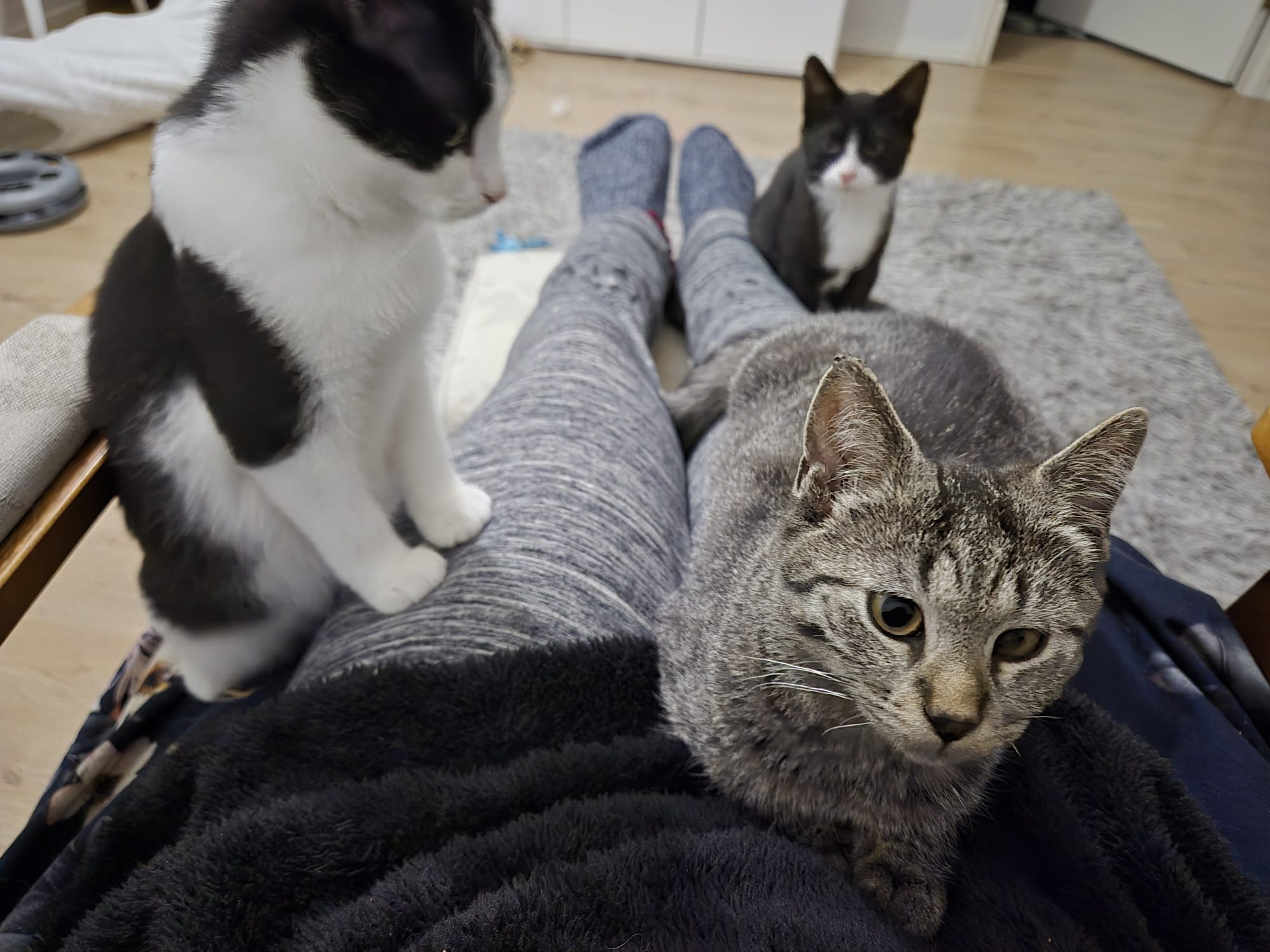 hitaasti lämpenevät emo ja pentu, jotka mieluiten seuraavat taustalta arjen tapahtumia, mutta leikkivät reippaasti ja vauhdikkaasti myös niitä leikittäessä. Herkut on näiden kohdalla -Se juttu- jonka vuoksi tulevat ihan lähellekin. Sähikäinen tulee jopa sylistä hakemaan ja Pehmotassuakin kovasti kiinnostaisi tulla mutta pysyttelee vielä sylistä pois.