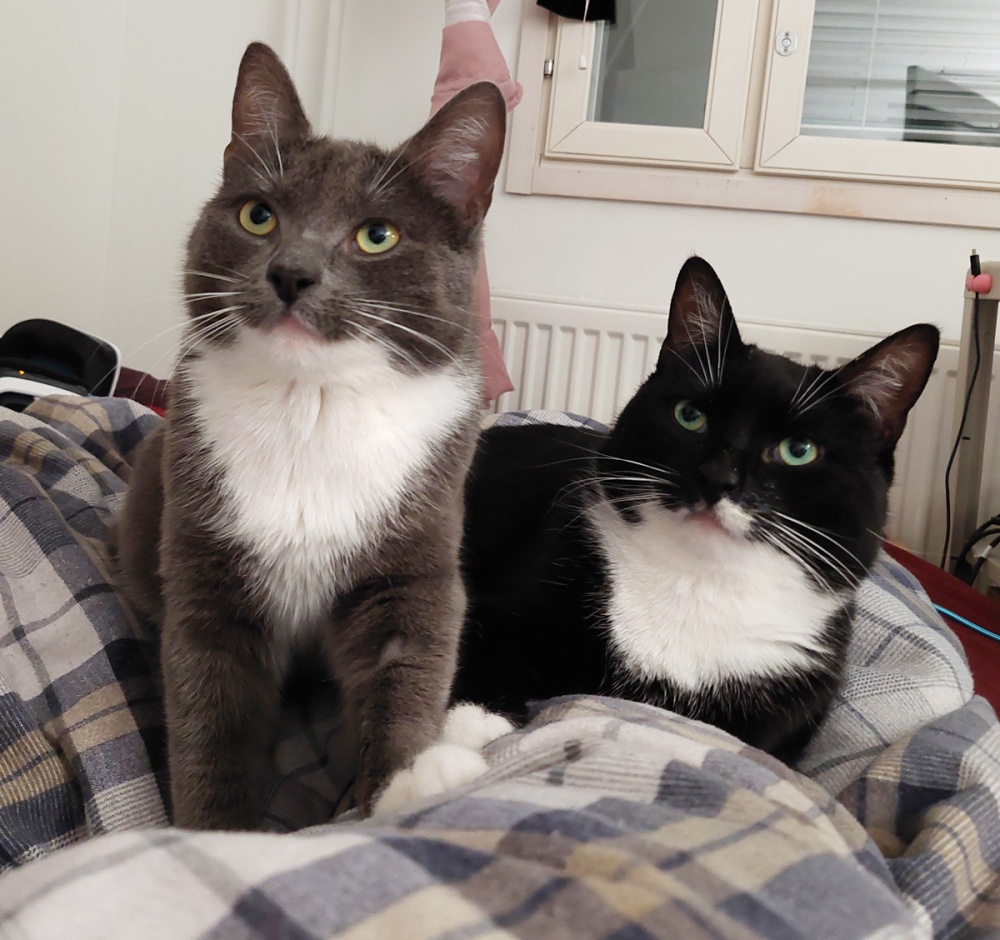 Neonin lempileikkejä on lelun noutaminen. Mitä kauemmin ihminen jaksaa heittää lelua sen parempi! Neon tykkää olla sylissä, kunhan ihminen ei liikahda ja pilaa hetkeä. Argon taas ei ole vielä hoksannut ihmisen sylin lämpöä, vaikka onkin kova puskemaan ja pyörimään jaloissa. Molemmat meistä voi silti löytää nukkumasta oman ihmisen vierestä. Ollaan myös kovia maukumaan varsinkin ruoka-aikaan ja Argon miukuu muutenkin millon mistäkin. Vaikka olemme energisiä ja ruoan jälkeen usein leikityttää, niin kyllä meille nukkuminenkin maistuu, varsinkin Argonille.