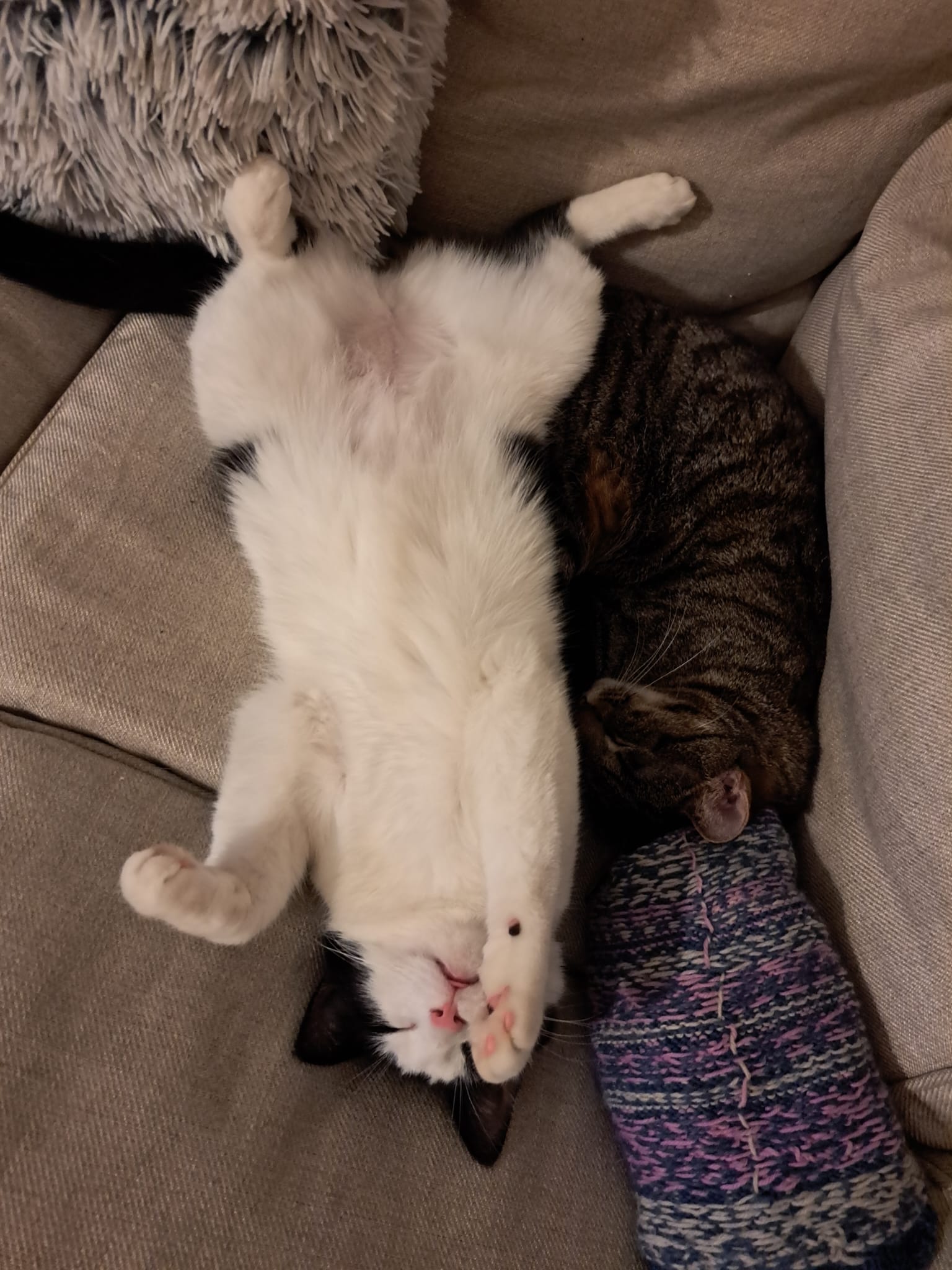 Molemmat ovat kauniskäytöksisiä, nämä ei turhasta valita tai huuda. Hiekkalaatikkojuttuja saa vielä aika ajoin harjoitella, että isot tarpeet osuu kokonaan laatikon reunan sisäpuolelle. Ruoka maistuu molemmille hyvin, possun sydämet ovat suurta herkkua ja juhlaruokaa.